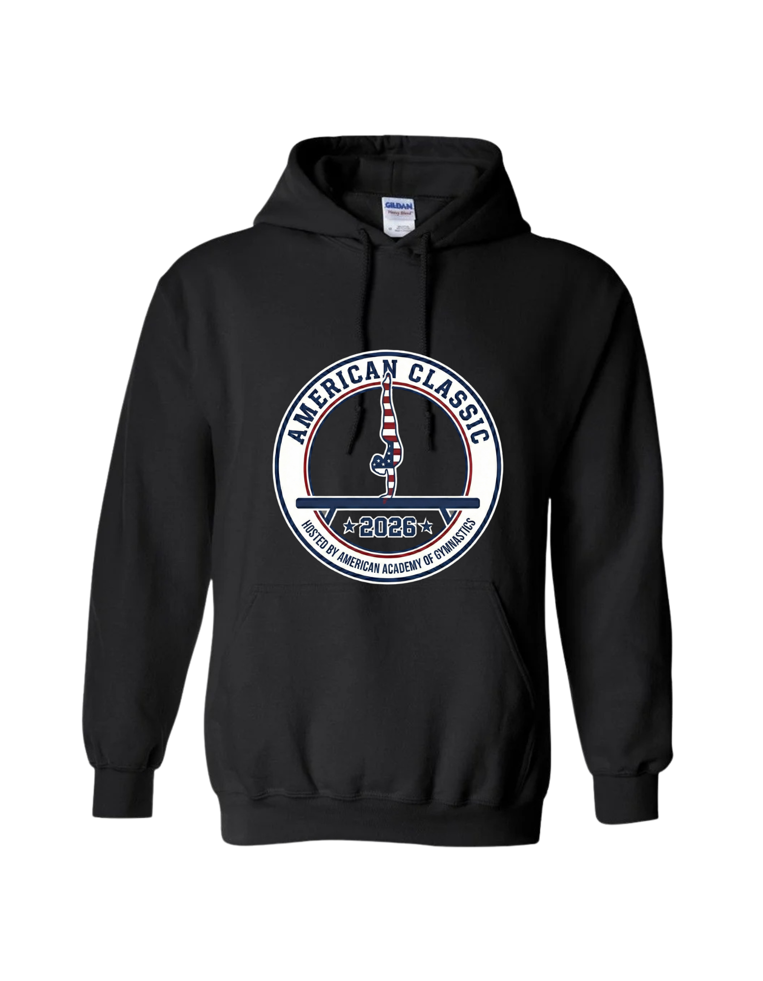 Celebrate your gymnastics passion with the AAG American Classic Hoodie! Choose between eye-catching glitter or sleek matte finishes to match your style. Customize your look with optional sleeve images featuring dynamic gymnast poses that showcase the sport you love. Commemorate your participation in this annual event hosted by American Academy of Gymnastics. Cozy, comfortable, and totally customizable—this hoodie is a must-have for any gymnast!