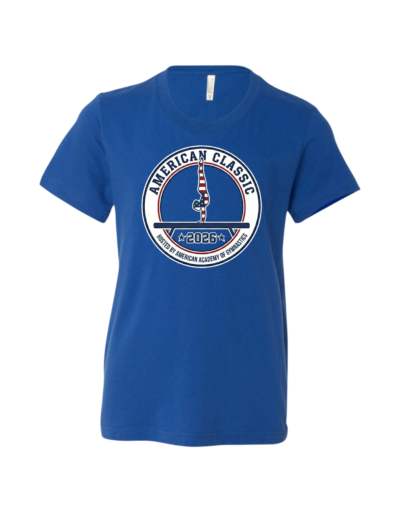 Celebrate your gymnastics passion with the AAG American Classic T-Shirt! Choose between eye-catching glitter or sleek matte finishes to match your style. Customize your look with optional sleeve images featuring dynamic gymnast poses that showcase the sport you love. Commemorate your participation in this annual event hosted by American Academy of Gymnastics. Cozy, comfortable, and totally customizable—this T-Shirt is a must-have for any gymnast!